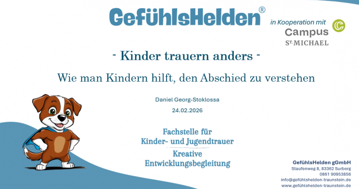 Vortrag zum Thema „Kinder trauern anders – Wie man Kindern hilft, den Abschied zu verstehen“ im Campus St. Michael in Traunstein.