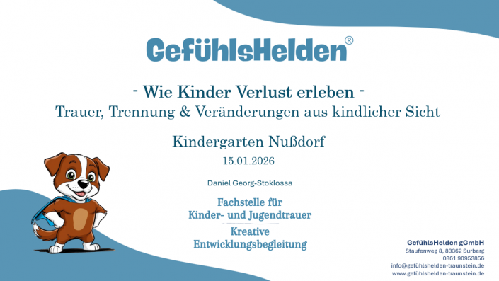 Im Kindergarten Nußdorf fand am 15.01.2026 im Rahmen eines Elternabends, sowohl für pädagogische Fachkräfte als auch für Eltern, ein Vortrag zum Thema „Wie Kinder Verlust erleben: Trauer, Trennung & Veränderungen aus kindlicher Sicht“ statt.